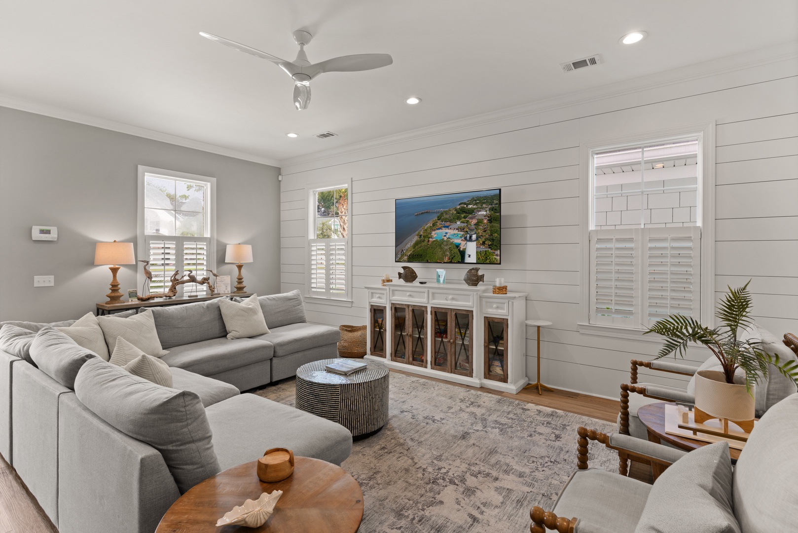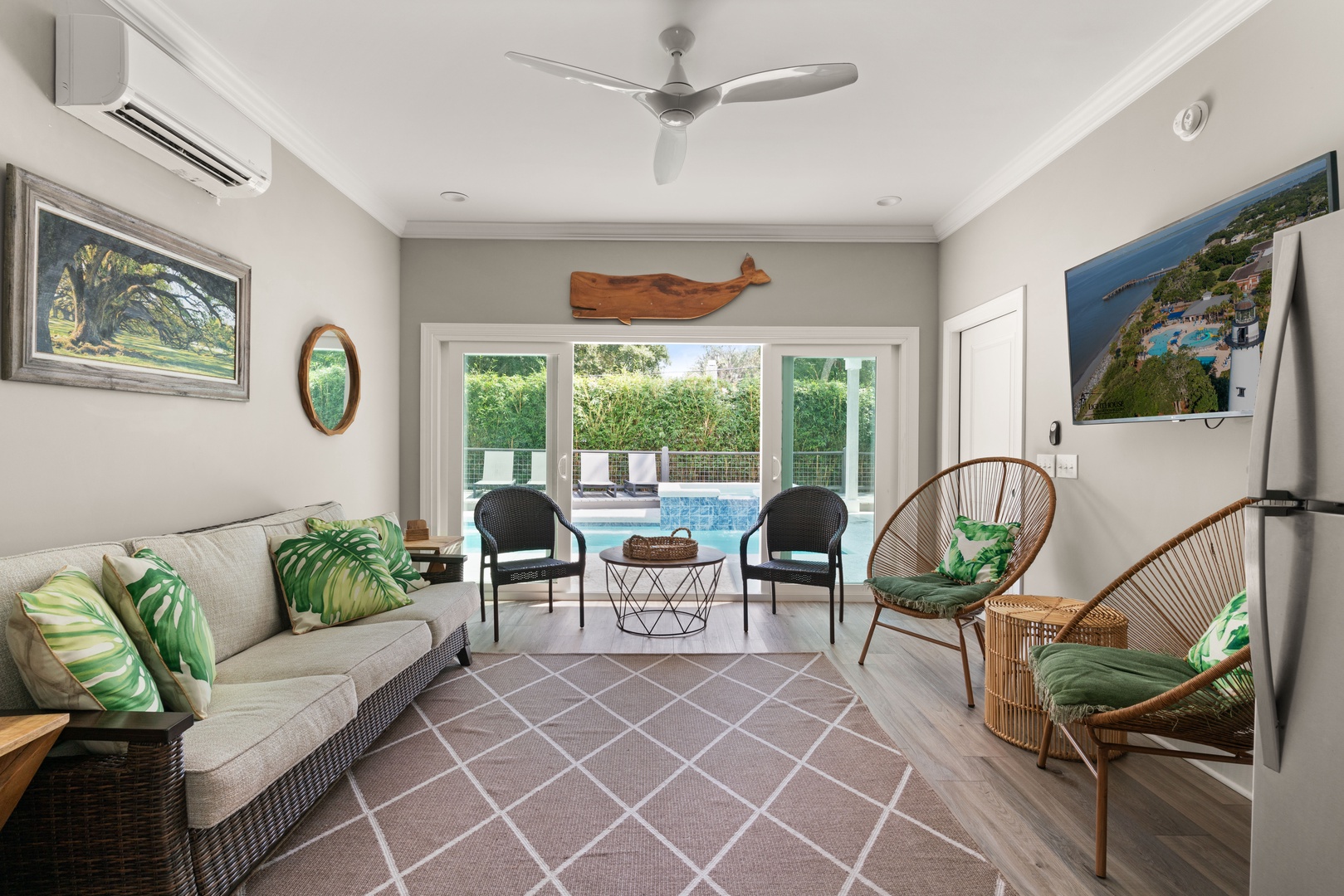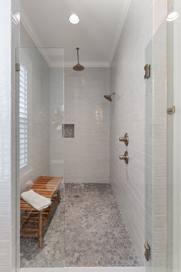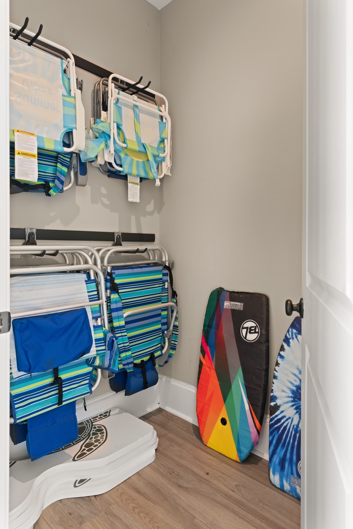 The pool house is your ultimate chill zone, fully furnished with a cozy secondary living space, an HD Smart TV, and a full bathroom with a shower. Plus, it includes a beach storage area stocked with everything you need for a day of fun in the sun—beach chairs for both adults and kids, a beach cart, an array of beach toys, and plush beach towels.