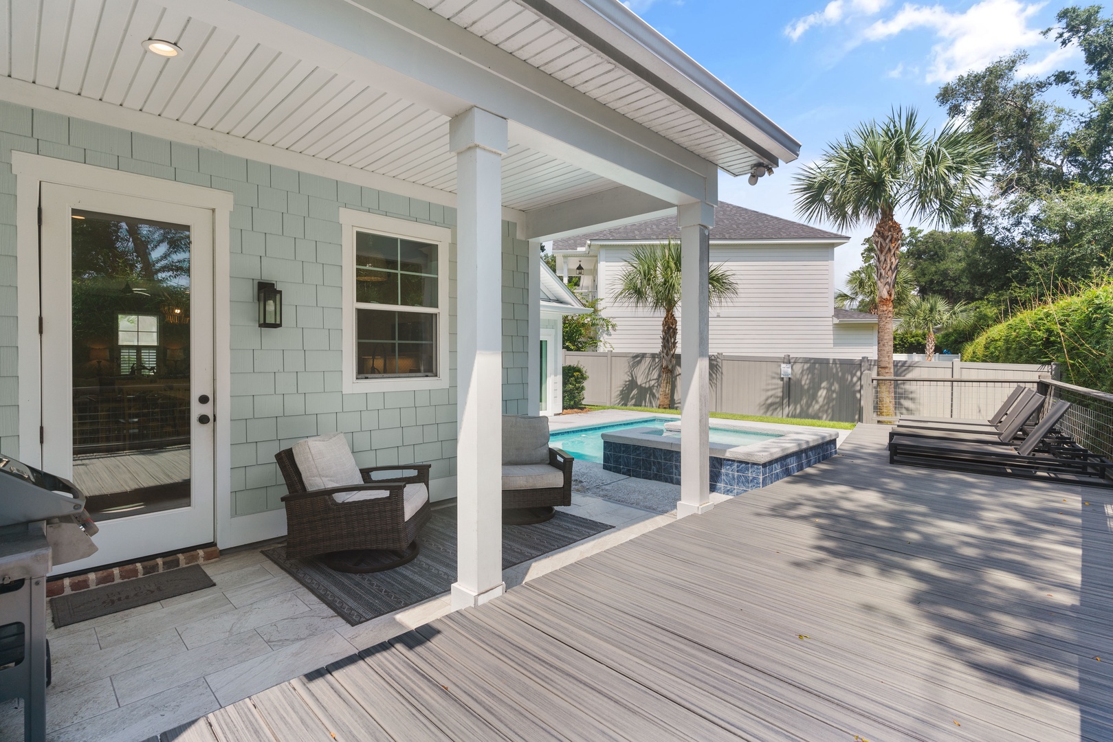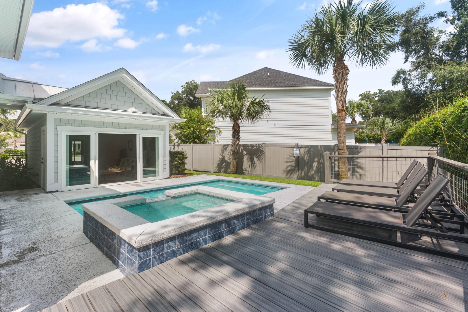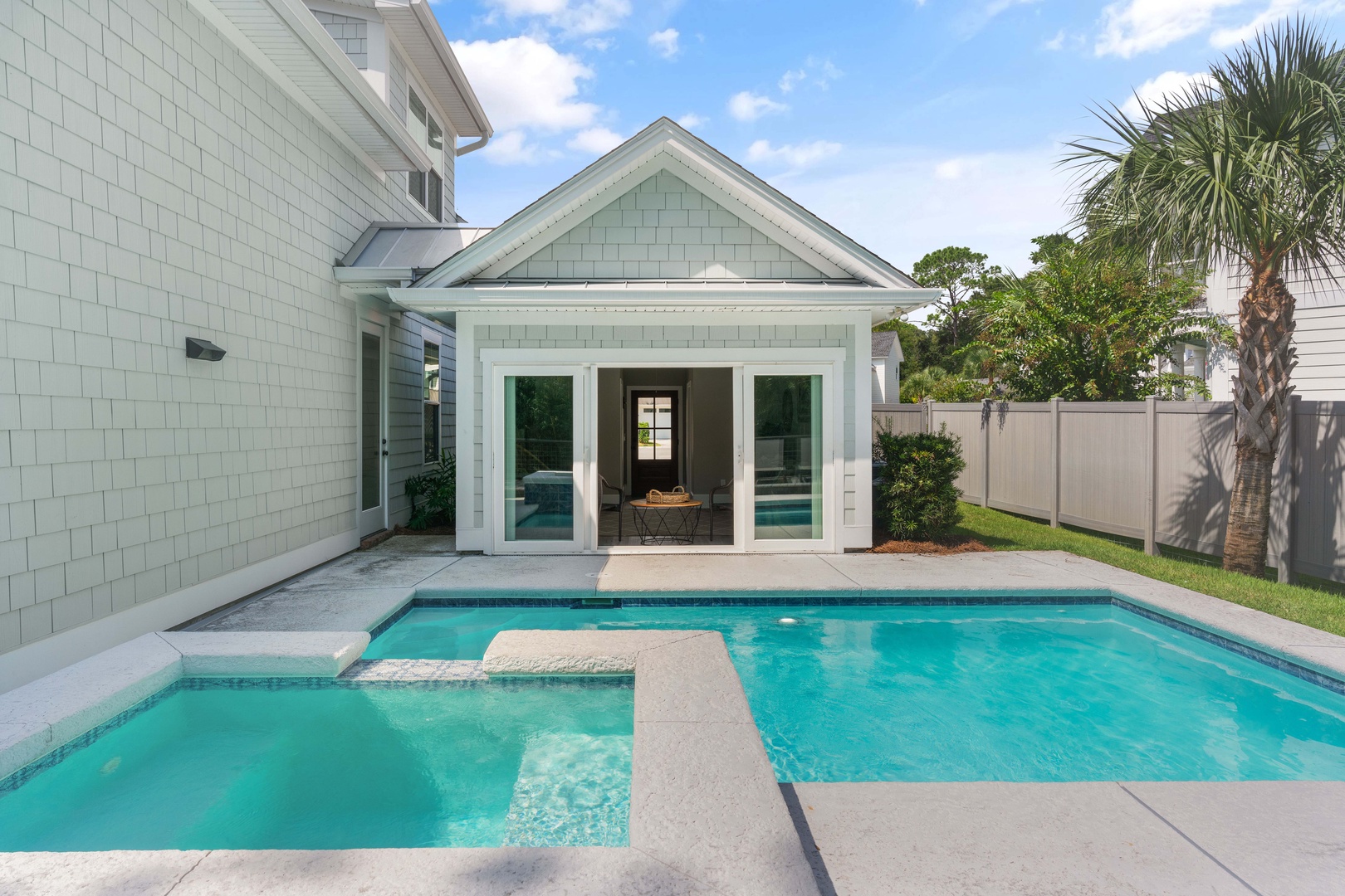 Just a short stroll away from pristine beaches, charming shops, and delectable dining options, Hook, Wine & Sinker is perfectly situated for both relaxation and adventure. Dive into your private oasis featuring a sparkling pool and spa, which can be heated upon request for an additional $75/day. The pool area is complemented by a cute chic pool house, complete with sliding doors that open directly to the water, creating an effortless indoor-outdoor living experience.