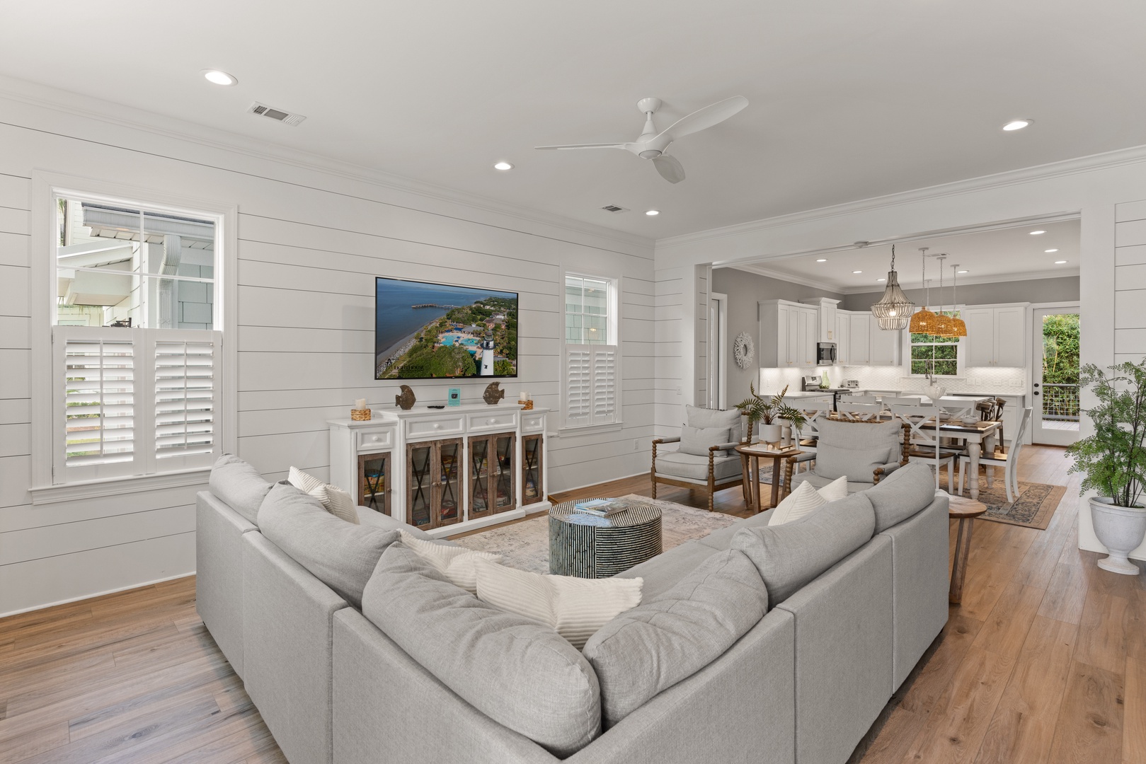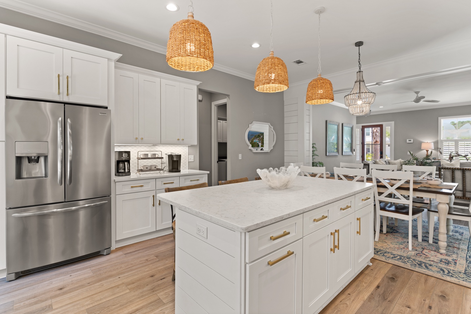 The main house features an open-floor concept living plan, making it the ideal spot to unwind and enjoy a movie or catch the big game! The chef's style kitchen is impeccably equipped and fully stocked with all the essentials you need to whip up any culinary masterpiece. The spacious dining table comfortably seats up to 10 guests, while the bar area provides additional seating for 3 more. For your morning coffee, you can choose between a drip style or a Keurig single style coffee maker. The kitchen also offers direct access to the back porch and pool area, where you can fire up the gas grill to prepare your favorite dishes.