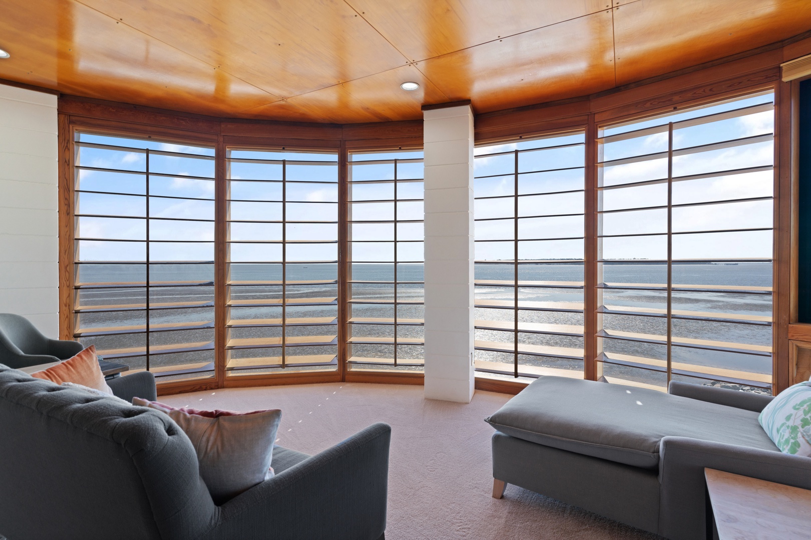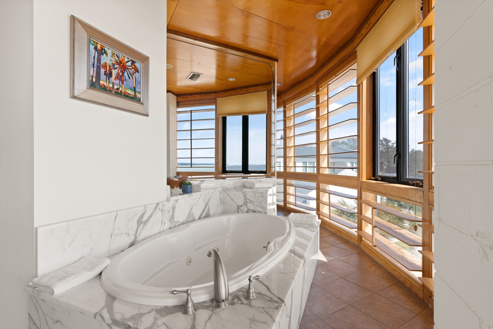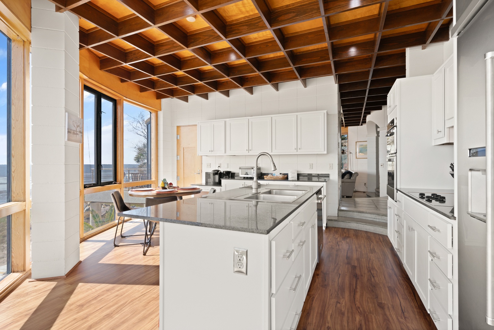 The home boasts custom cypress hardwood floors, a magnificent heart pine staircase, and handcrafted wood details throughout. Enjoy breathtaking ocean views from every room, with oversized plantation shutters, a large skylight, and expansive windows that let in natural light. The spacious layout features a main living area on the second floor, with an open-concept kitchen and dining area that’s perfect for meals shared with loved ones.