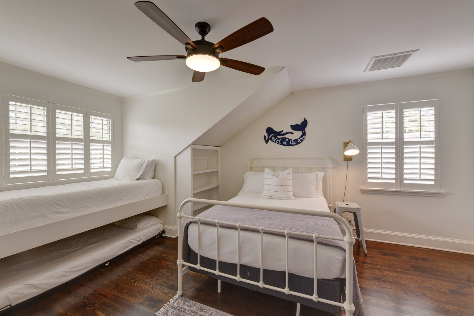 Bedroom 3 – Upstairs, Full size bed (sleeps 2), single semi bunk and roll out trundle (sleeps 2)