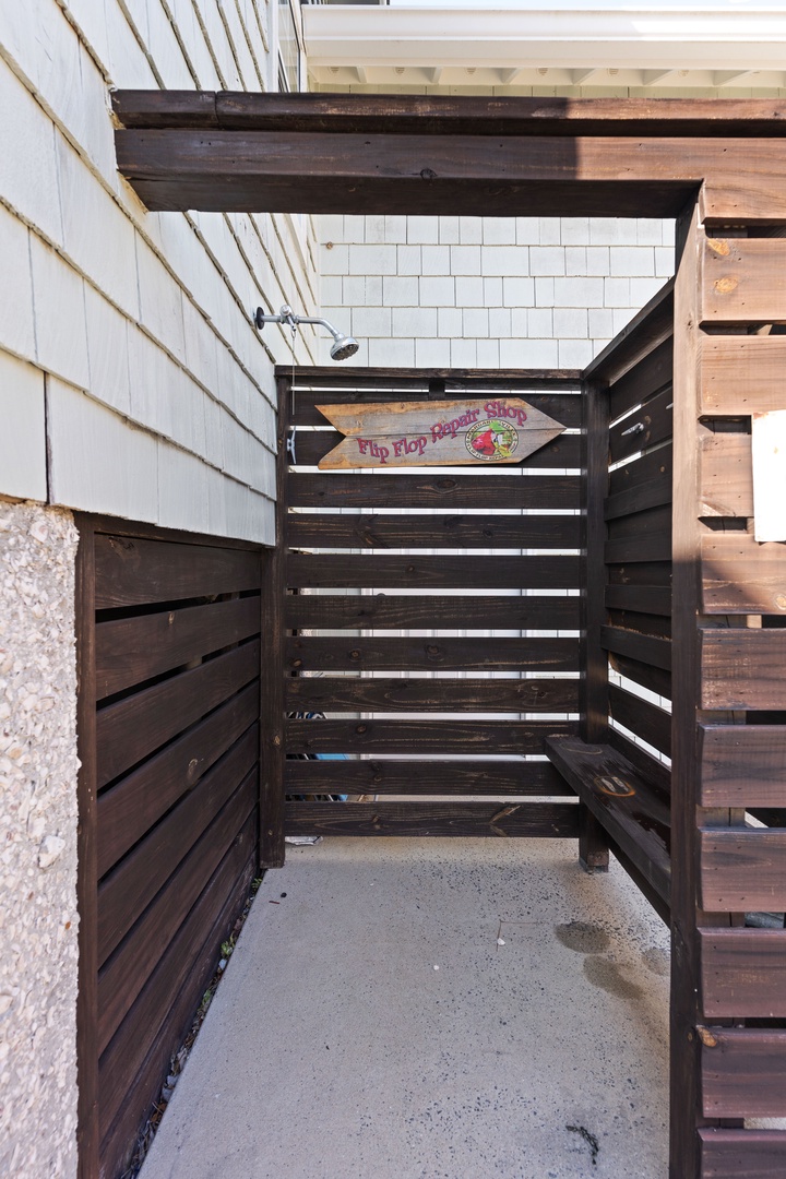 Outdoor shower has cold water only.