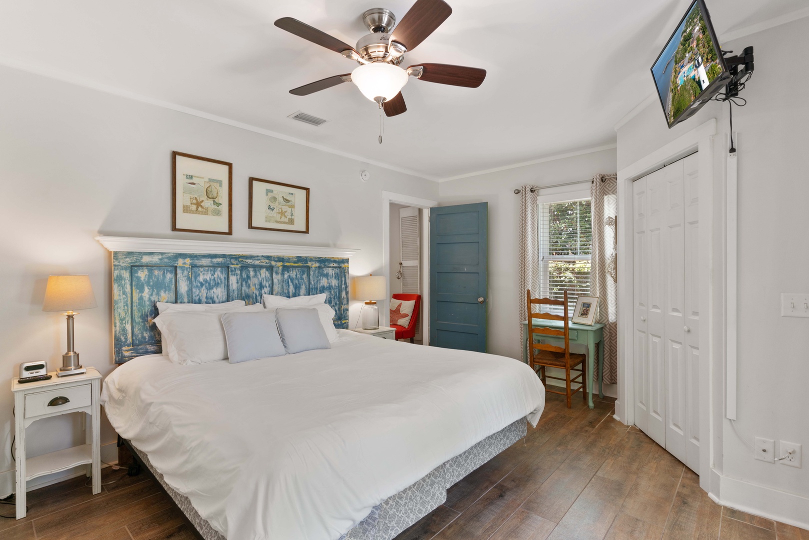 Bedroom 1 – Main level, Primary, King (sleeps 2), Enusite Bathroom, entry to back expansive lawn and patio