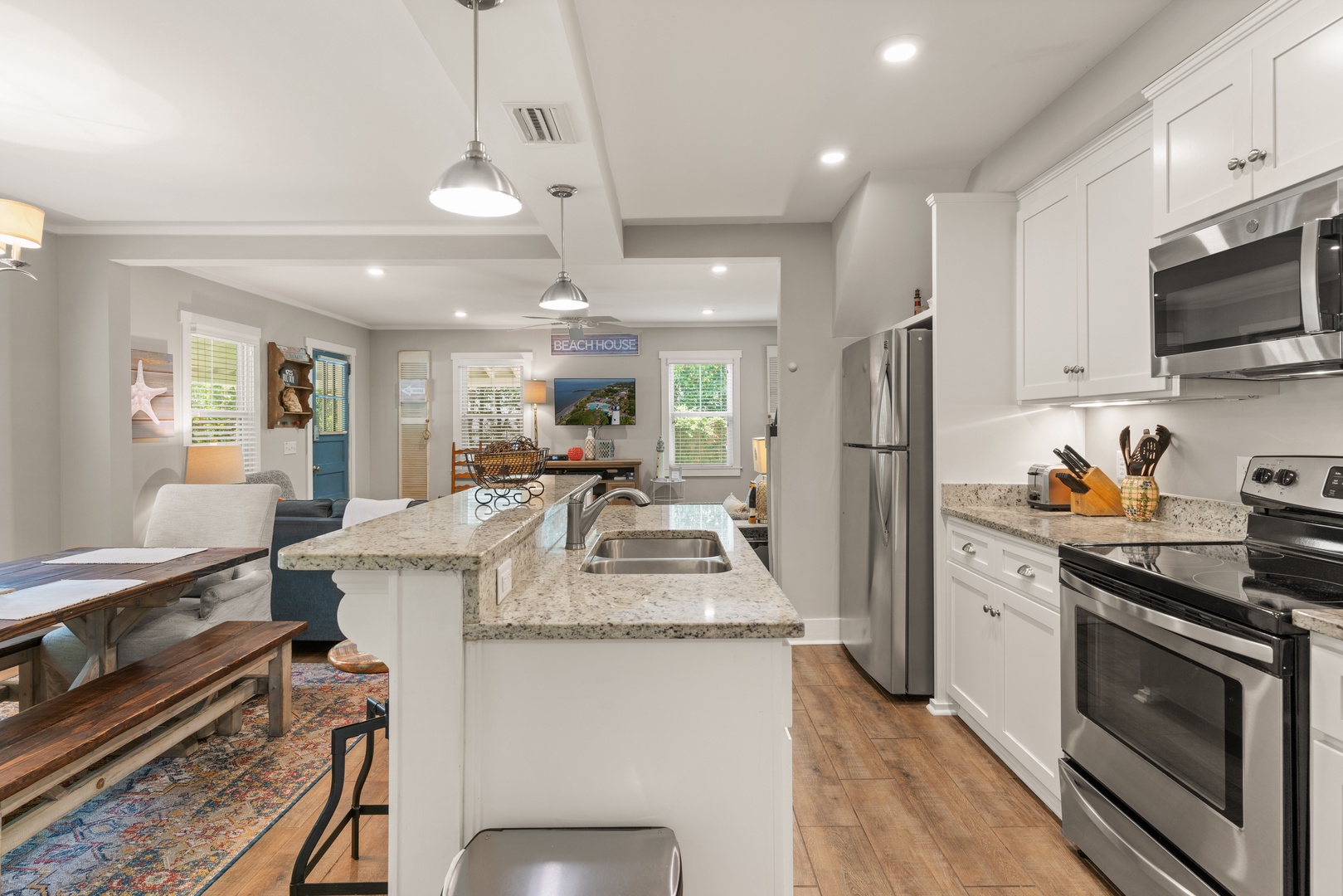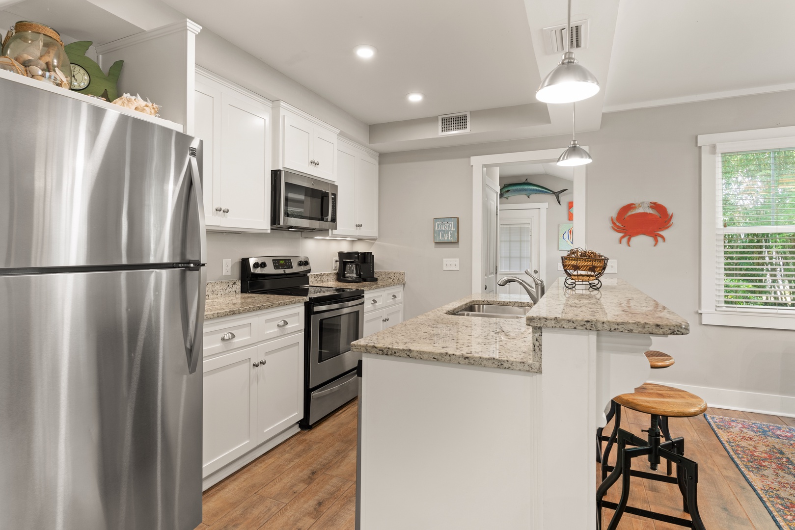 Experience the best of both worlds at The Porch Side Cottage - a cozy retreat just steps away from the beach and a place that feels like home. Our inviting cottage is the perfect getaway for families, with a layout designed for relaxation. Enjoy the tranquil atmosphere as you unwind on the porch, surrounded by the shade of live oaks, or take a leisurely stroll to the nearby beach entrance for easy access to the sun and sand.