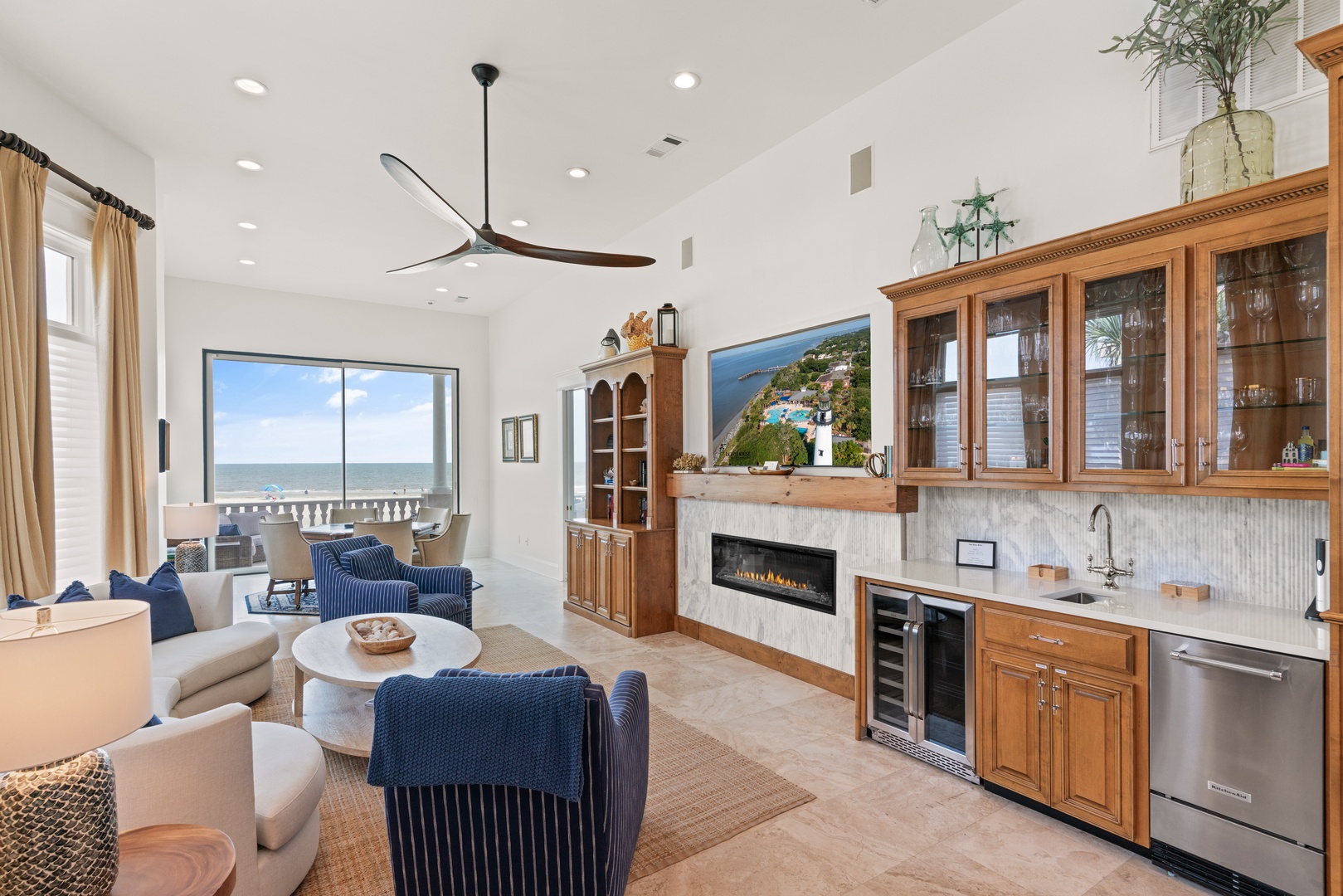 The beach access is just a few steps from the home's entrance. Although this home is ocean front, please note that the public beach access can be tide dependent. High tide occurs twice over a 24 hour period. During those times, you can enjoy the private deck or sandy play area in front of the home and keep the sunbathing going, or slip inside to get ready for a night out.