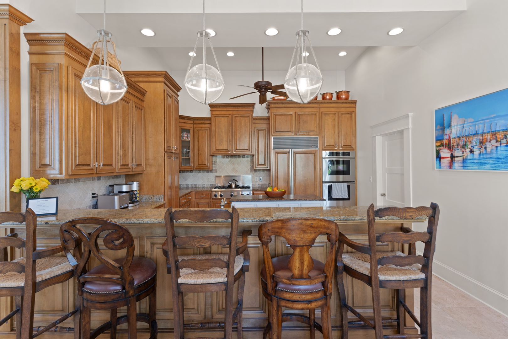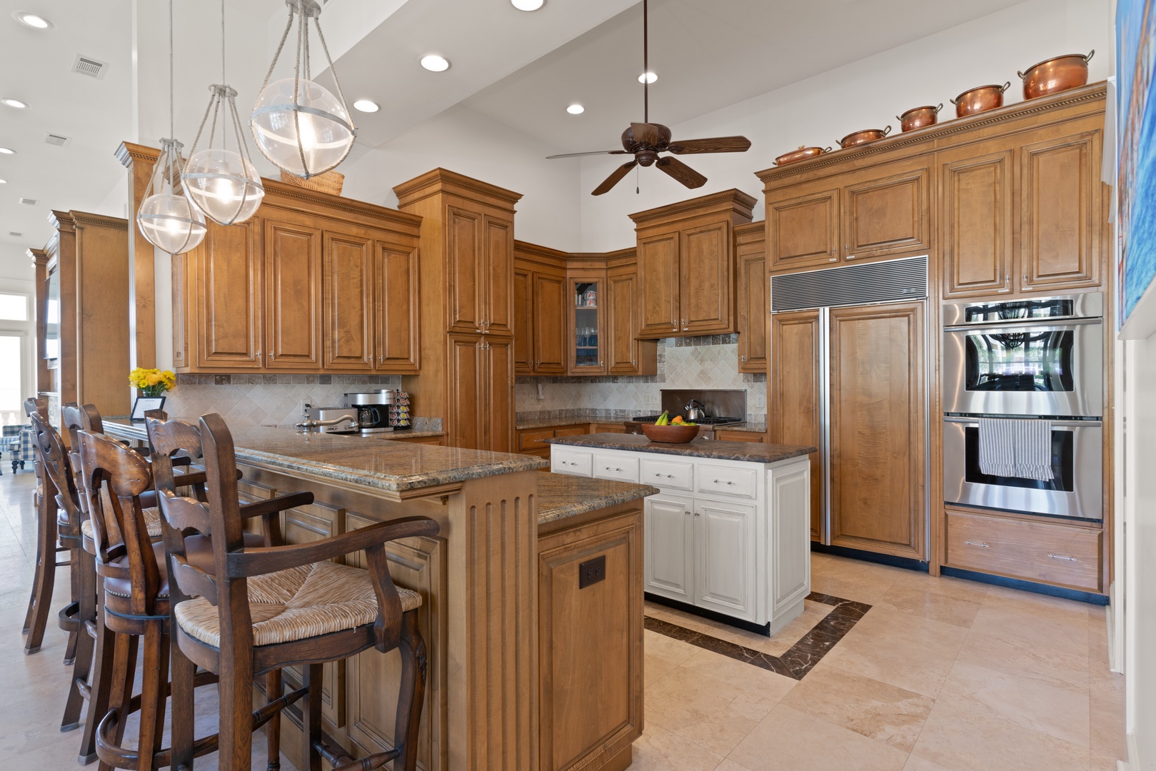 The indoor kitchen has ample storage, double oven, 4-burner natural gas stove with center grill plate, Keurig Duo coffee maker and all the kitchen utinsels needed to make a gourmet meal.