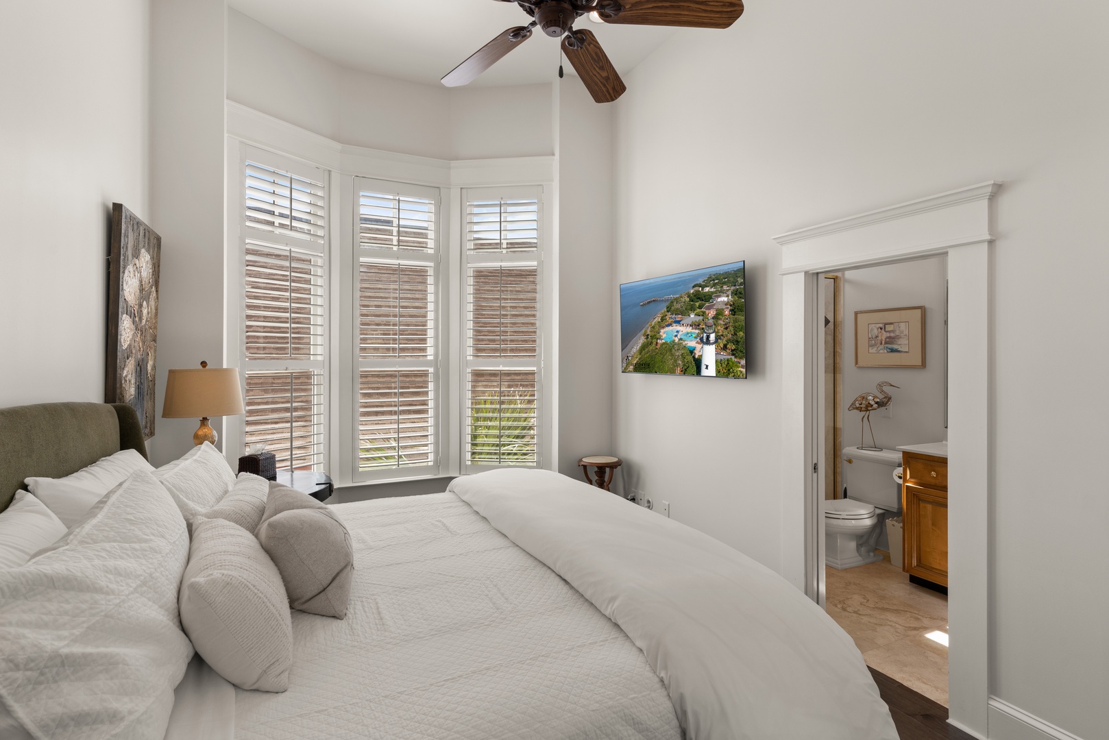 • Guest Suite is located midway down the hall with a King bed (sleeps 2), TV and adjoining bathroom with combo tub/shower, single vanity and walk in closet.
