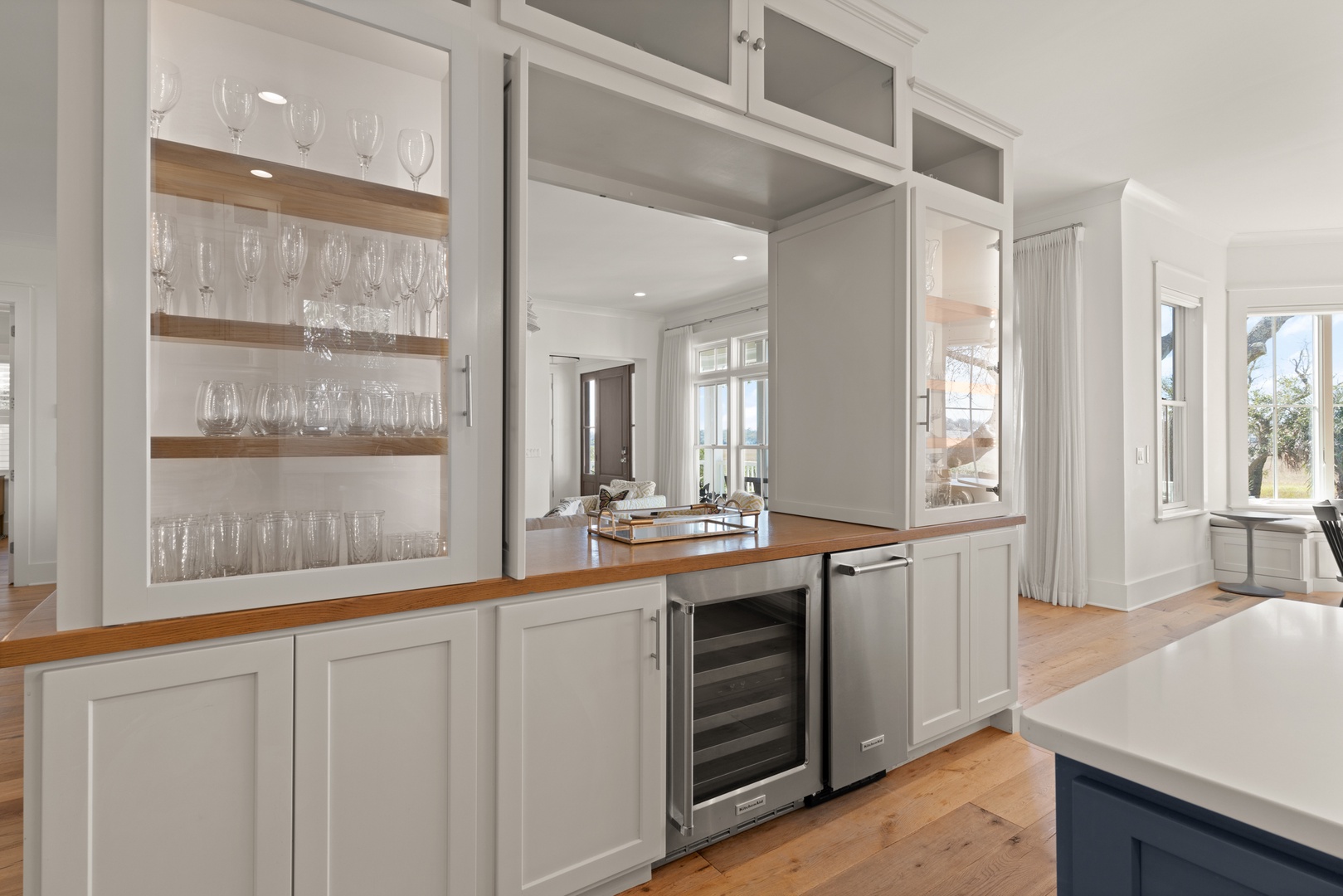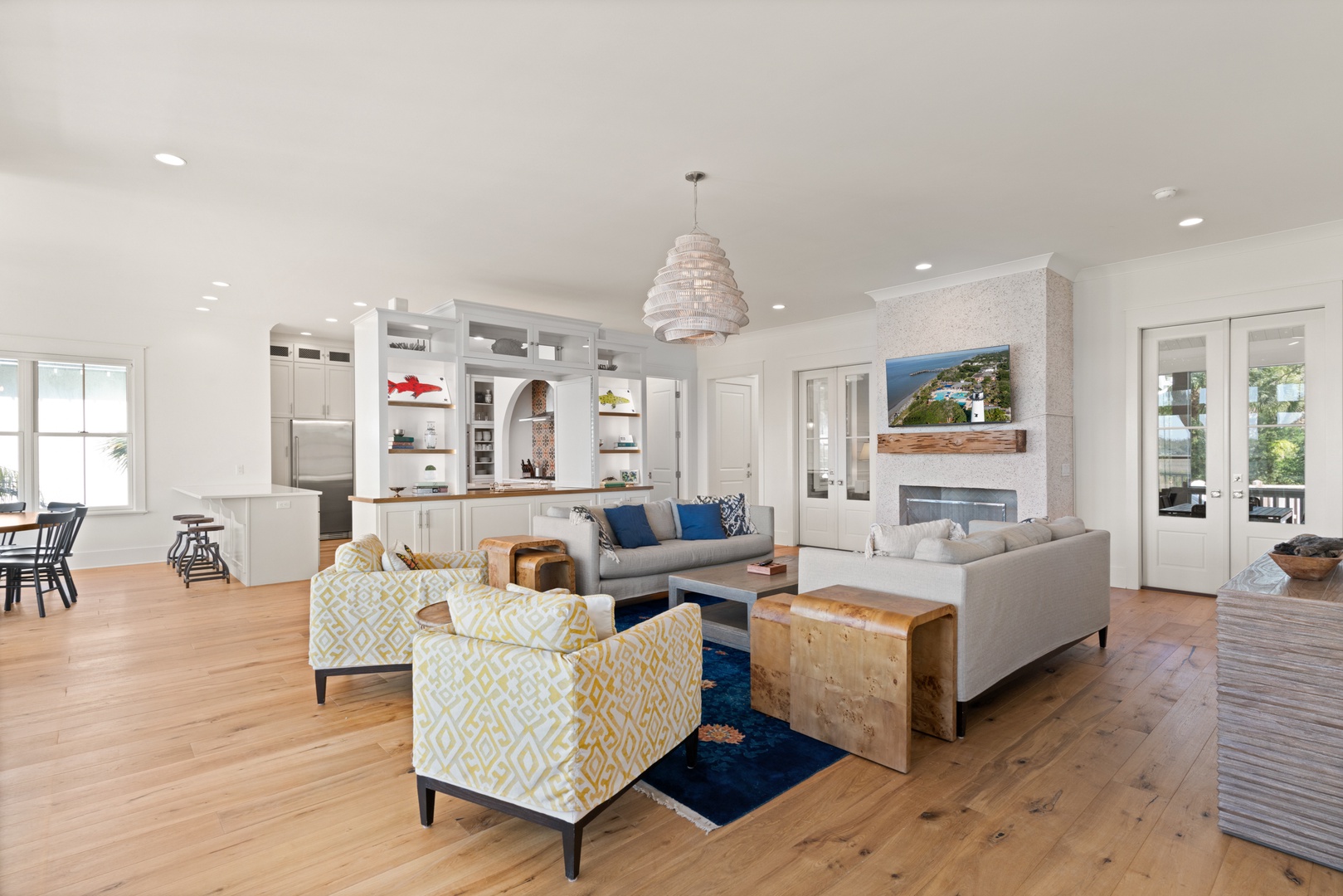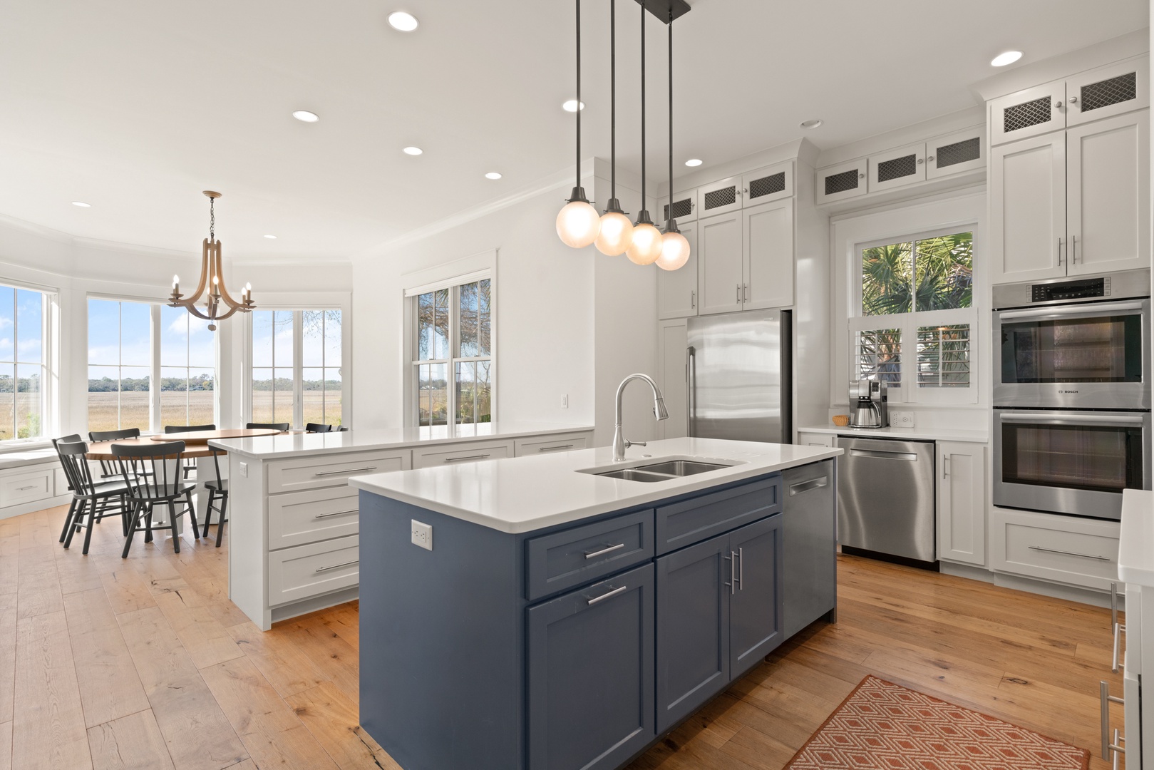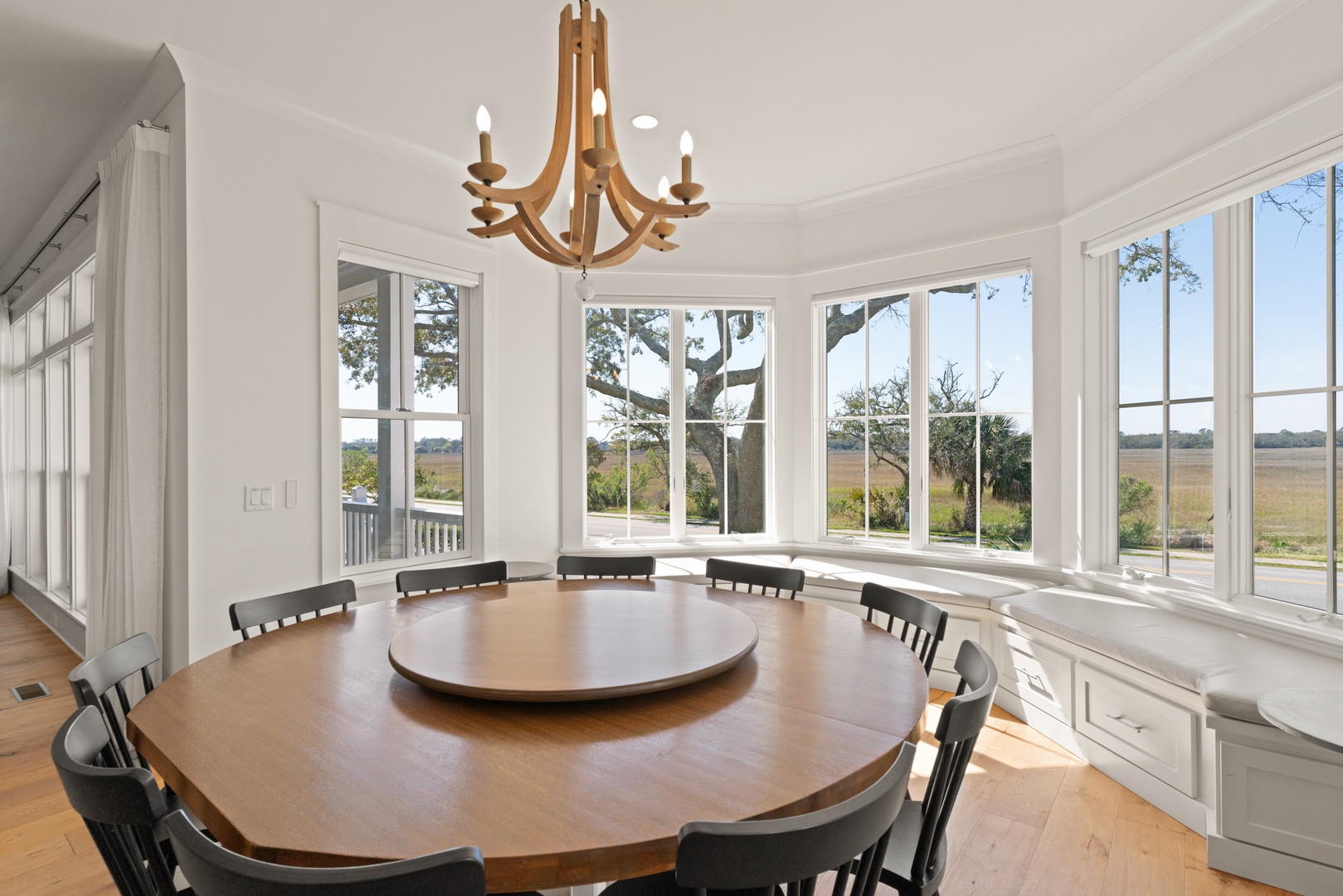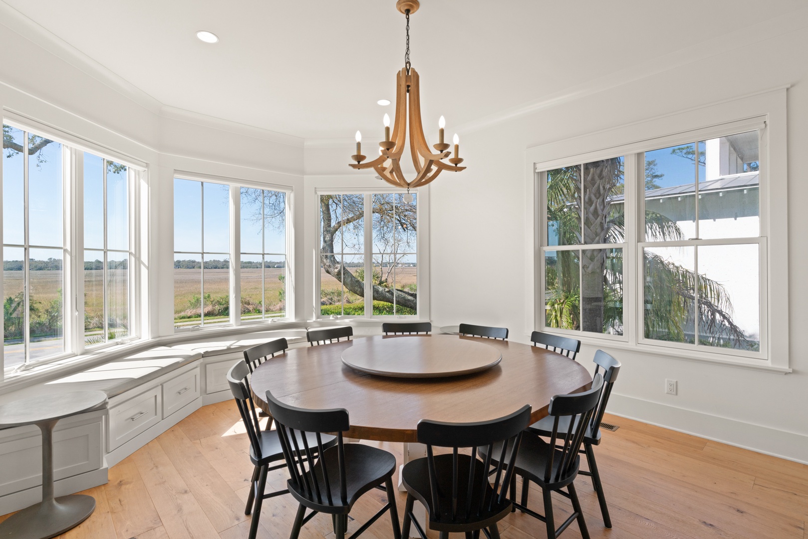 Large round dining room table accommodates 10-guests and 3-bar stools at the kitchen bar.