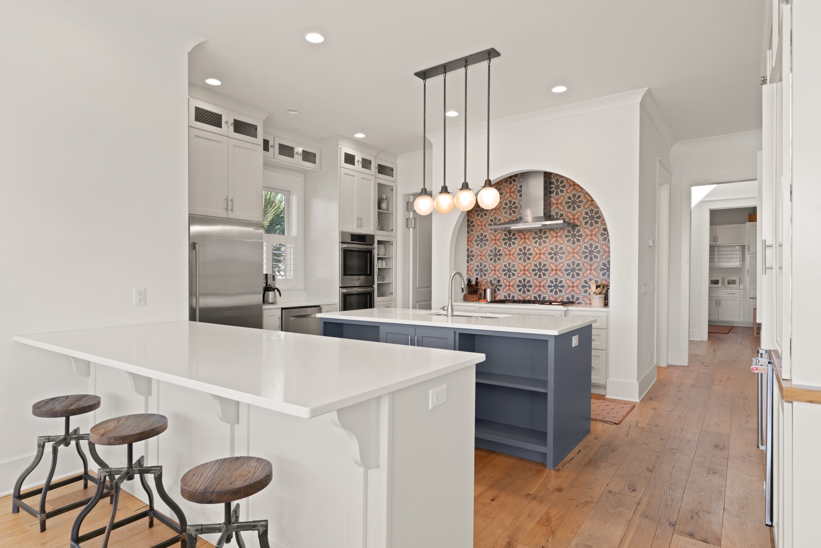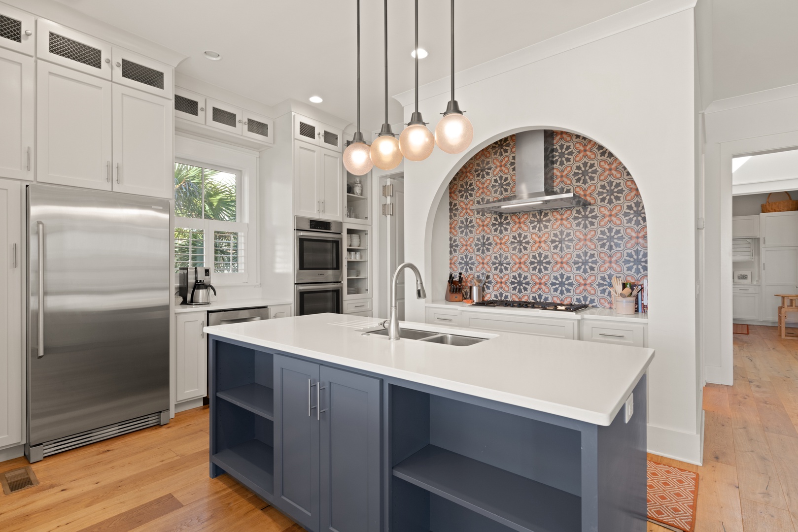 Kitchen is nicely equipped with 5-burner gas range, 2 ovens, Bosch dishwasher, and microwave.