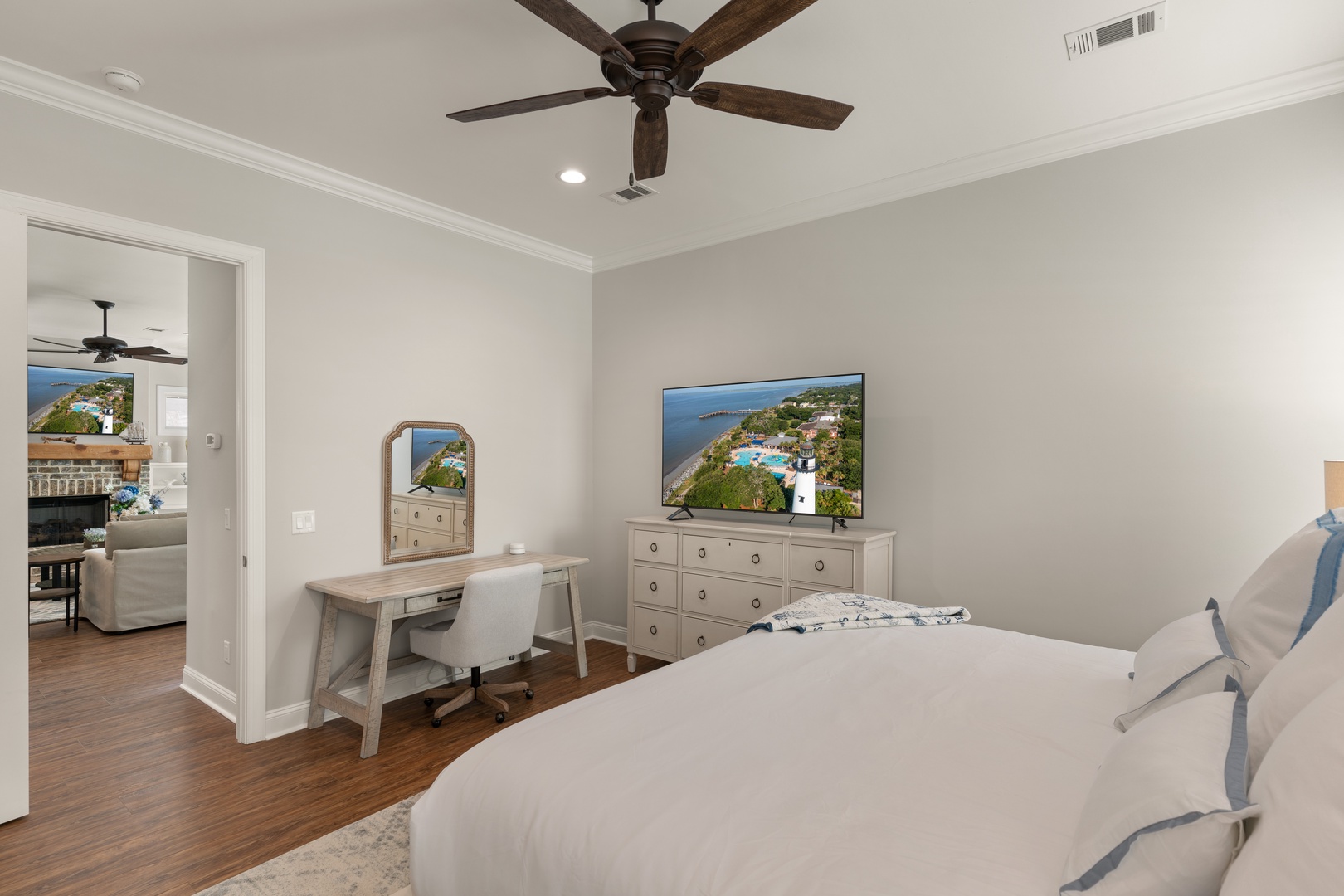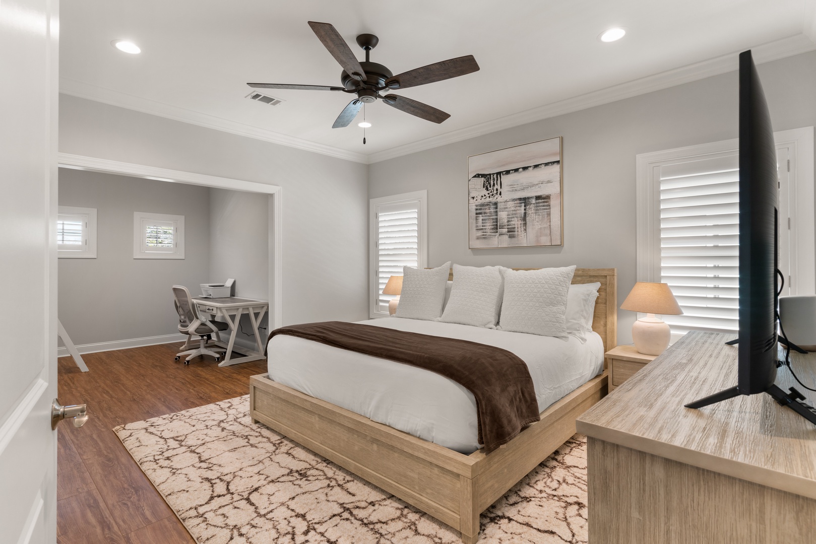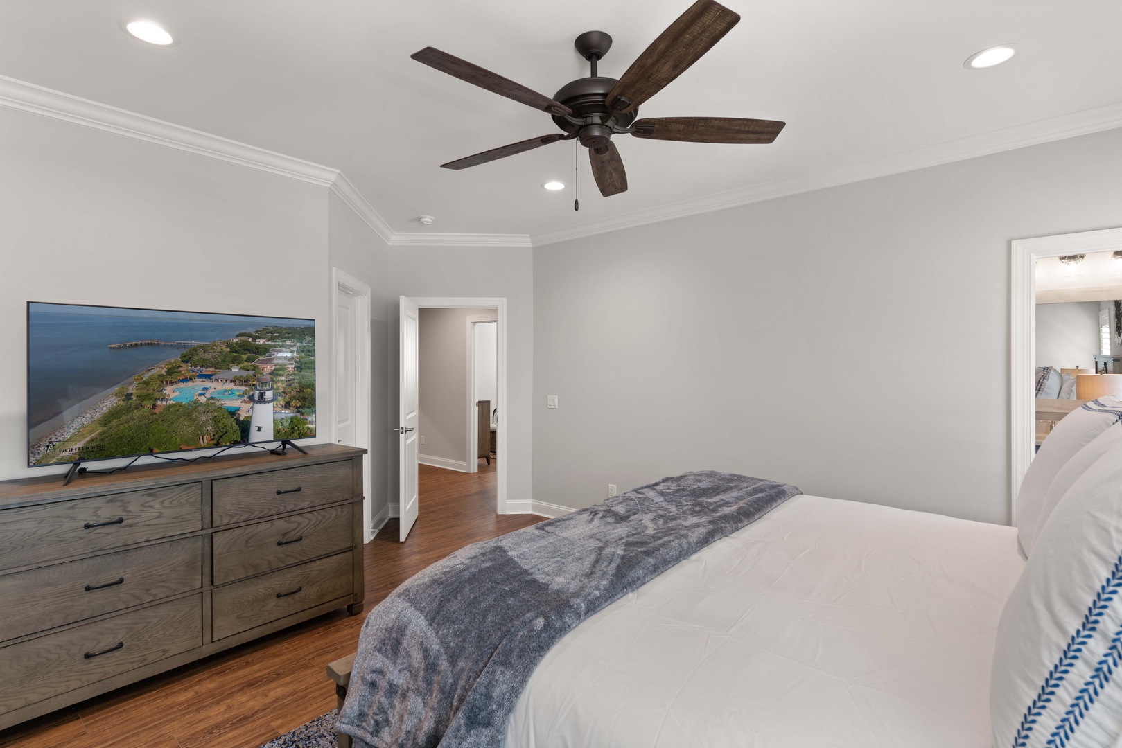 For those who love spending time outdoors, the home features a screened-in porch that overlooks the pool. The porch is also equipped with a large smart TV, allowing you to catch up on your favorite shows or watch a movie while enjoying the fresh air.
