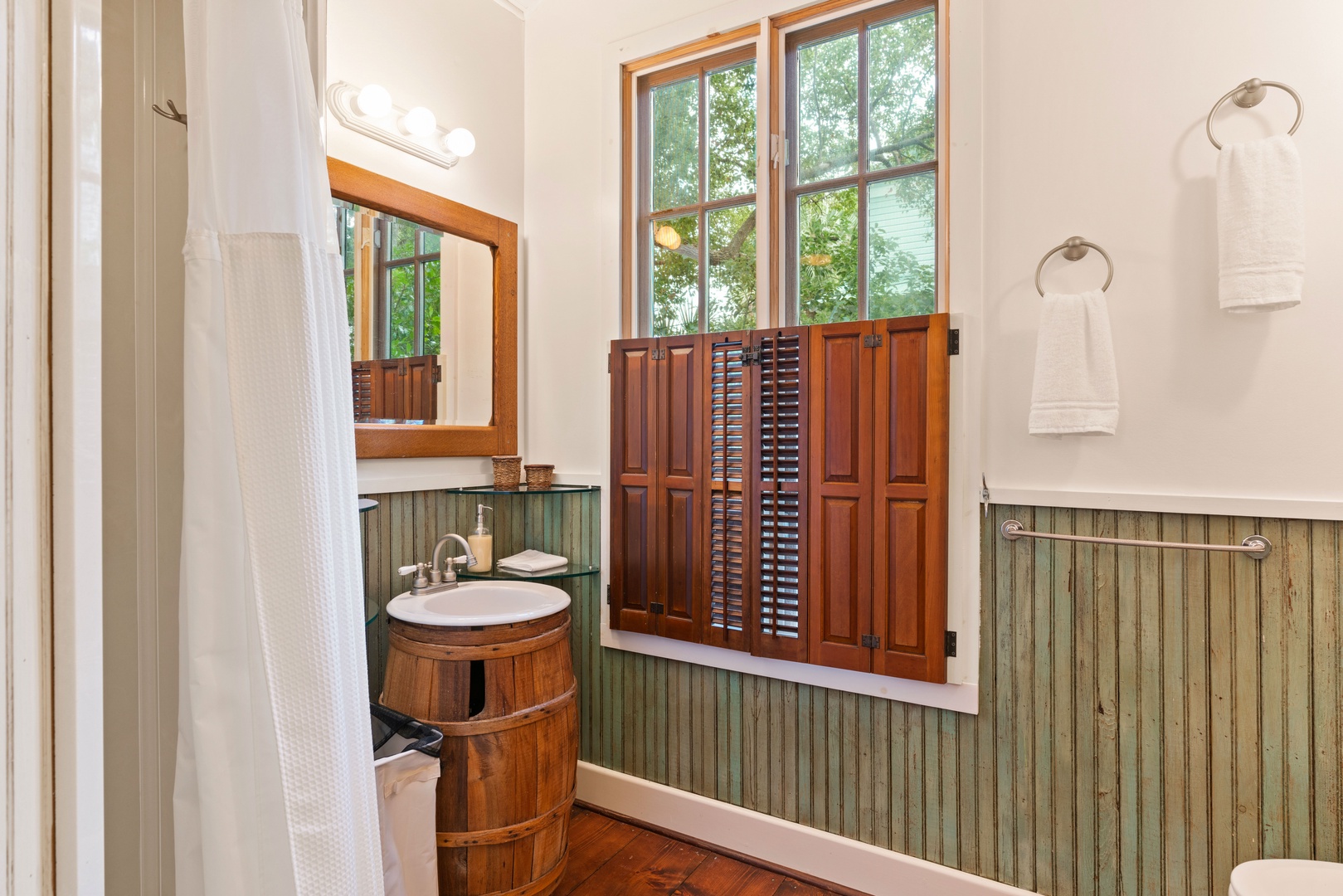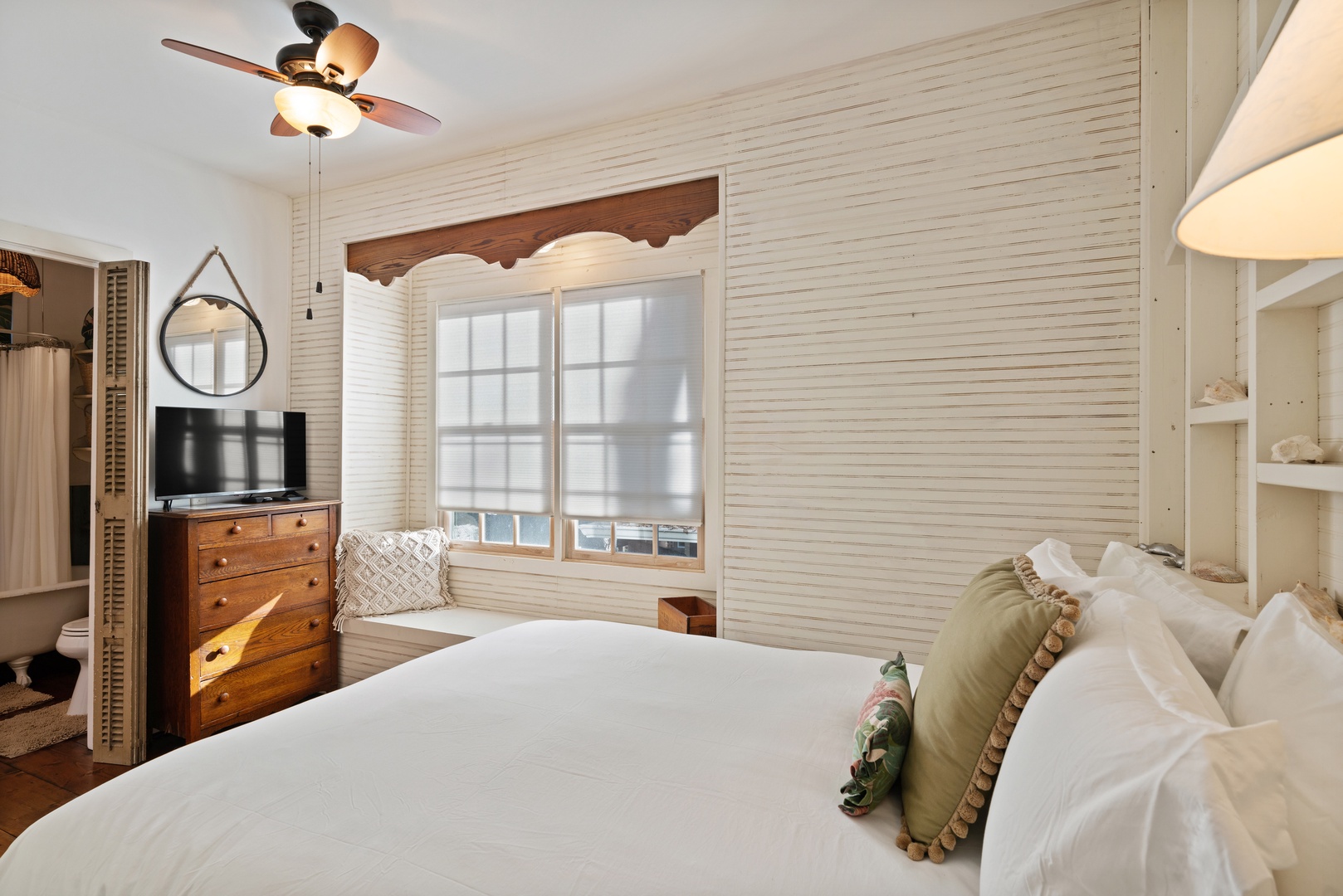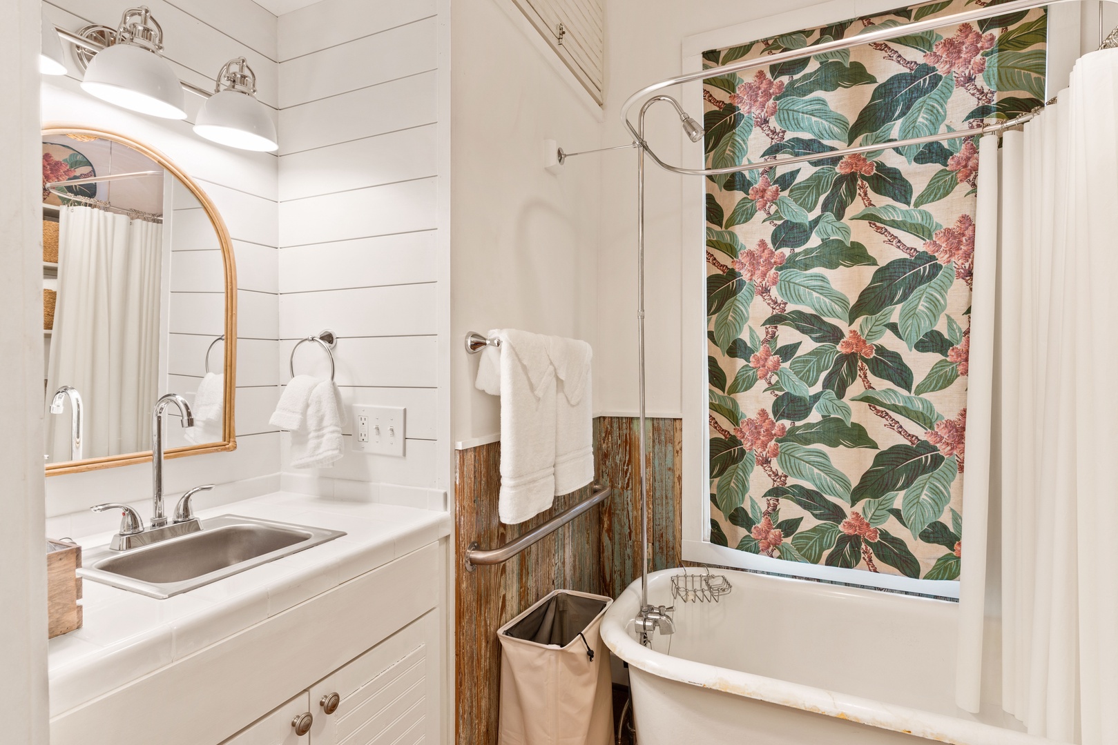 Behind the spiral staircase and off the kitchen is a bedroom with a full size bed (32" smart TV), adjoining a private bathroom with a clawfoot tub with a shower. Beyond this bedroom is a hall bathroom with a shower for additional guest use.