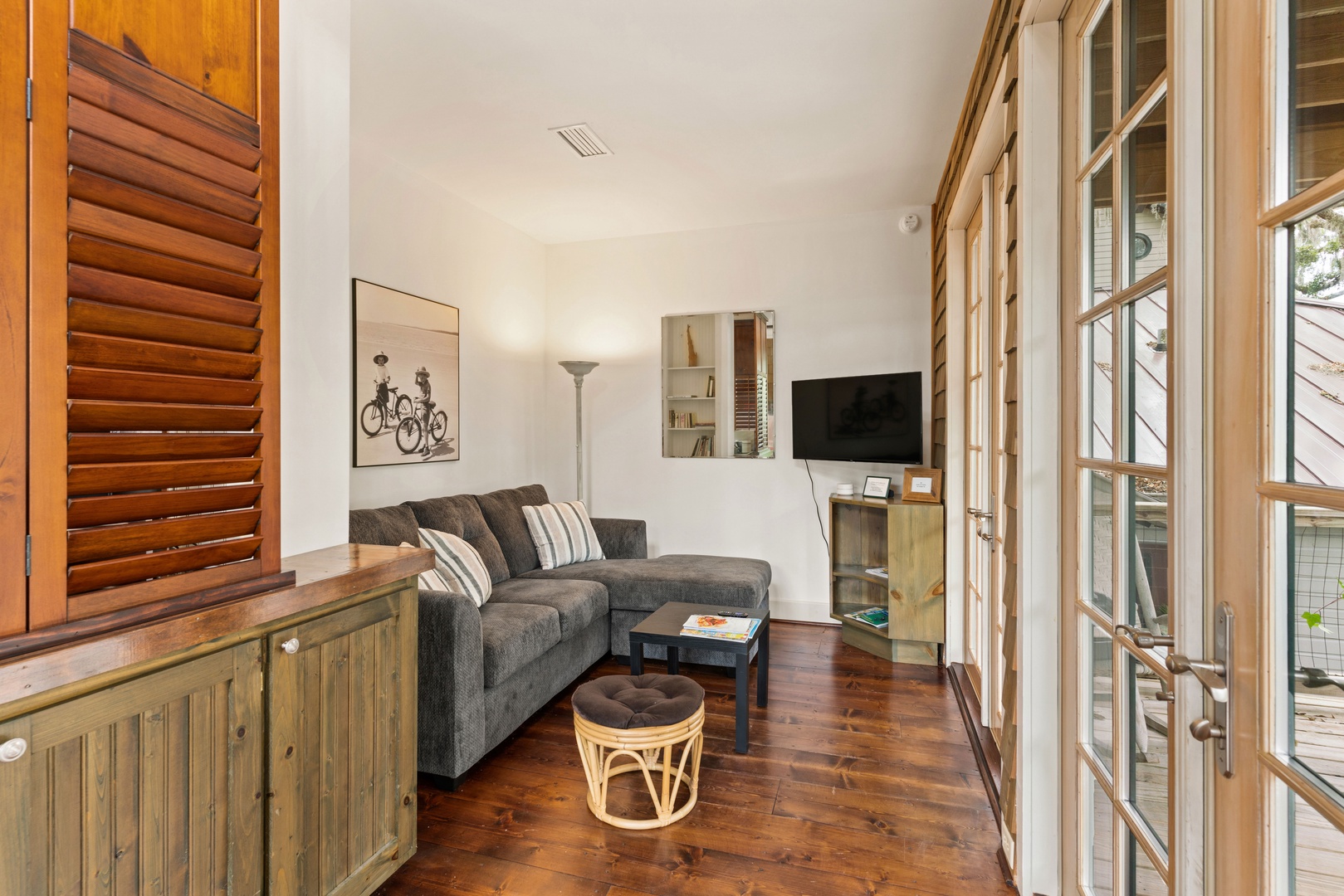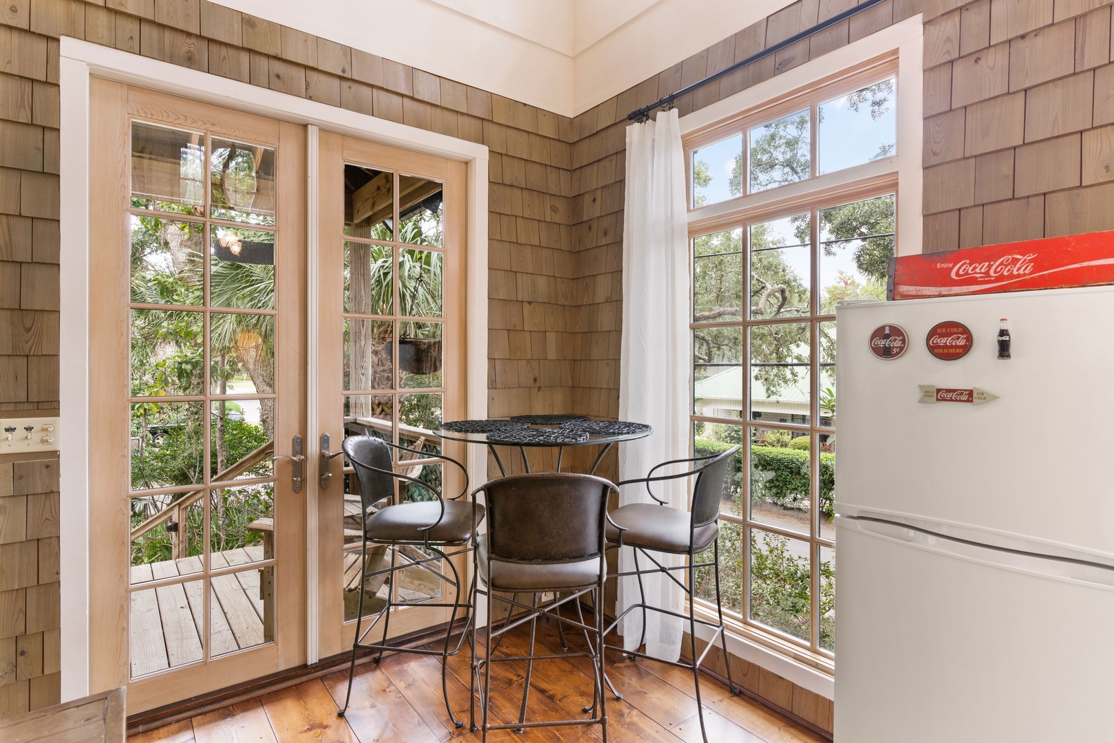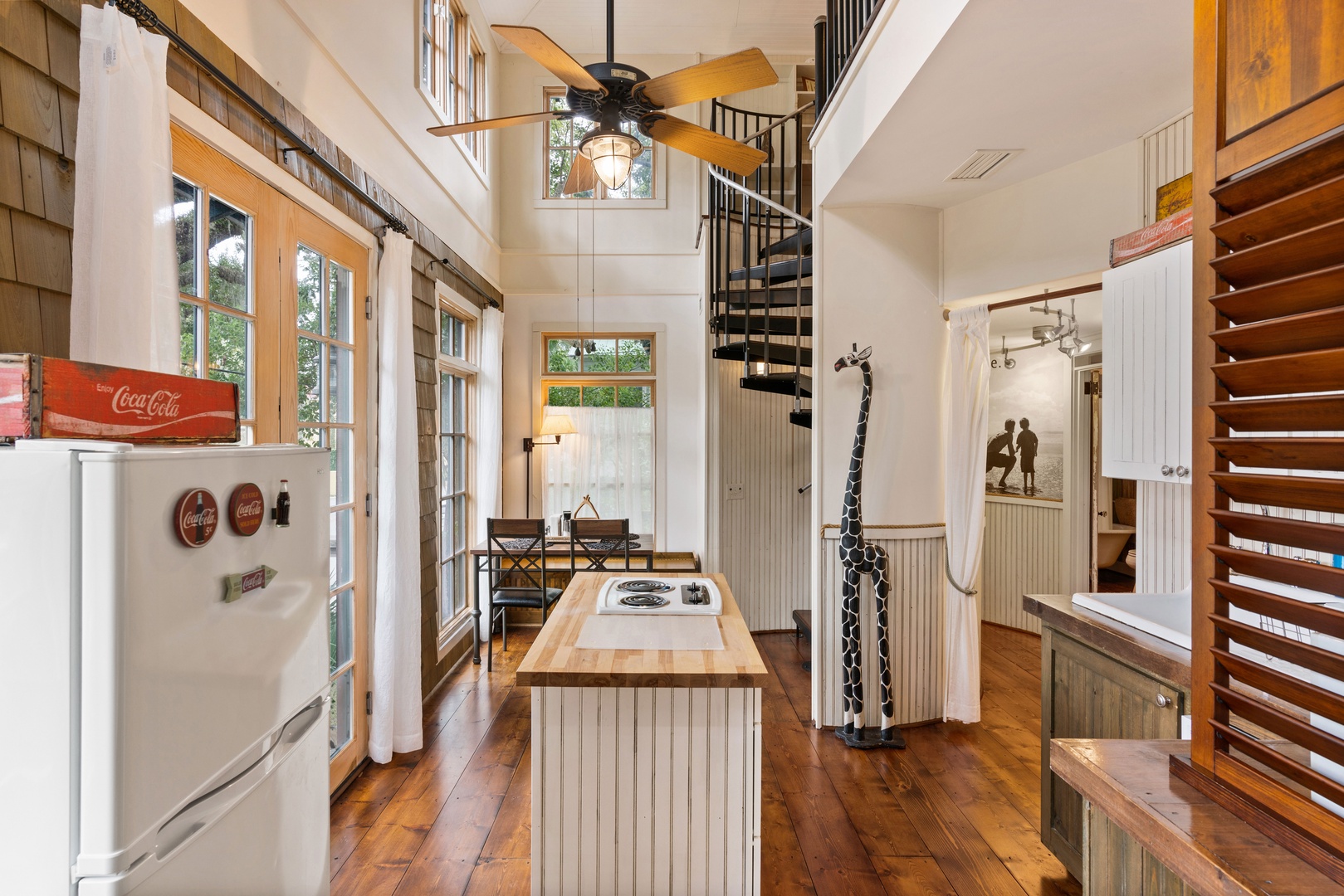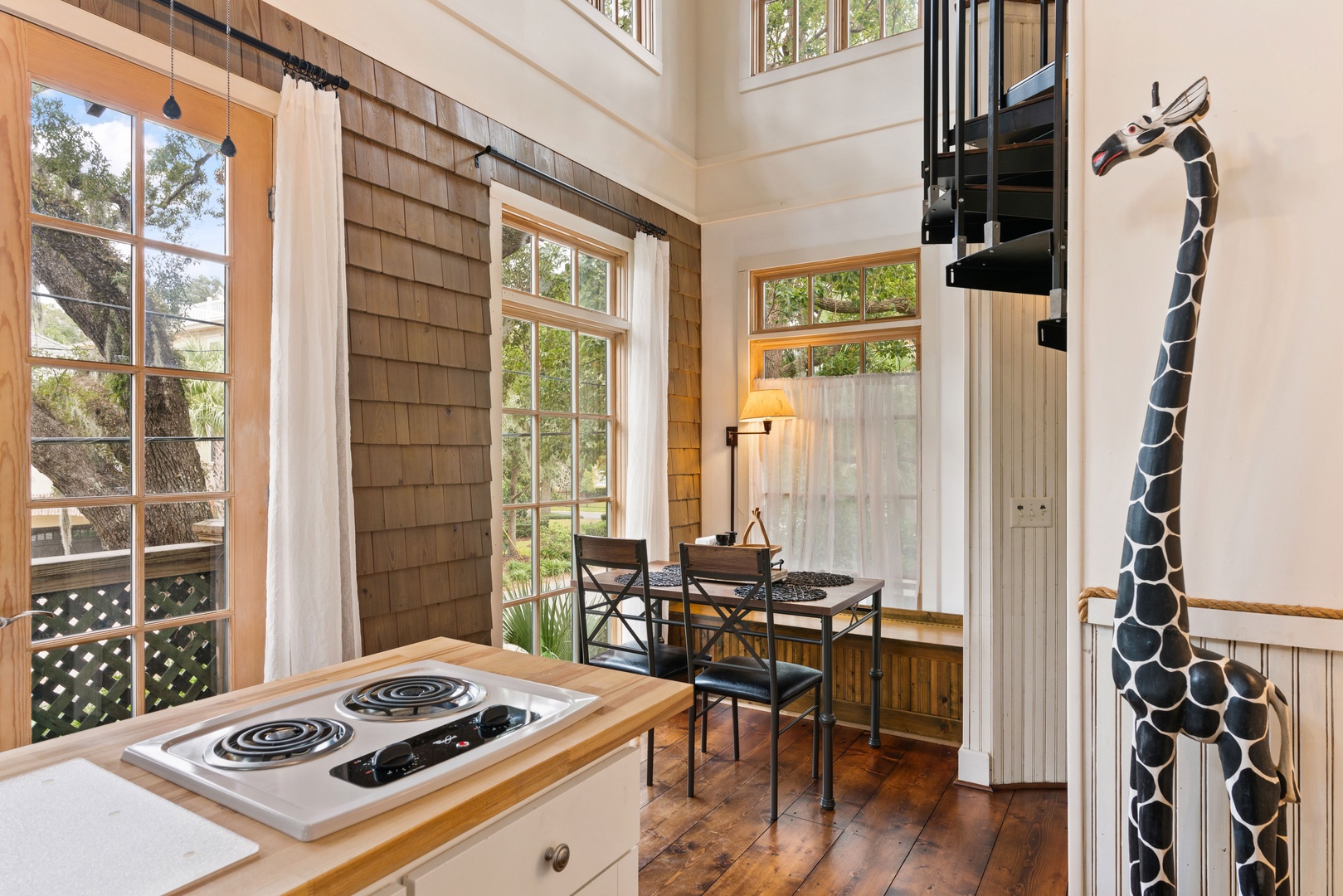 Enter through the front porch into the quant sitting room with a smart TV. You have a small kitchenette with a 2-burner cooktop, dishwasher, microwave single serve coffee maker, blender and toaster oven. Sorry, there is NOT A REGULAR OVEN. The dining area seats 4 guests and a high top at entry is comfortable for 3 guests.