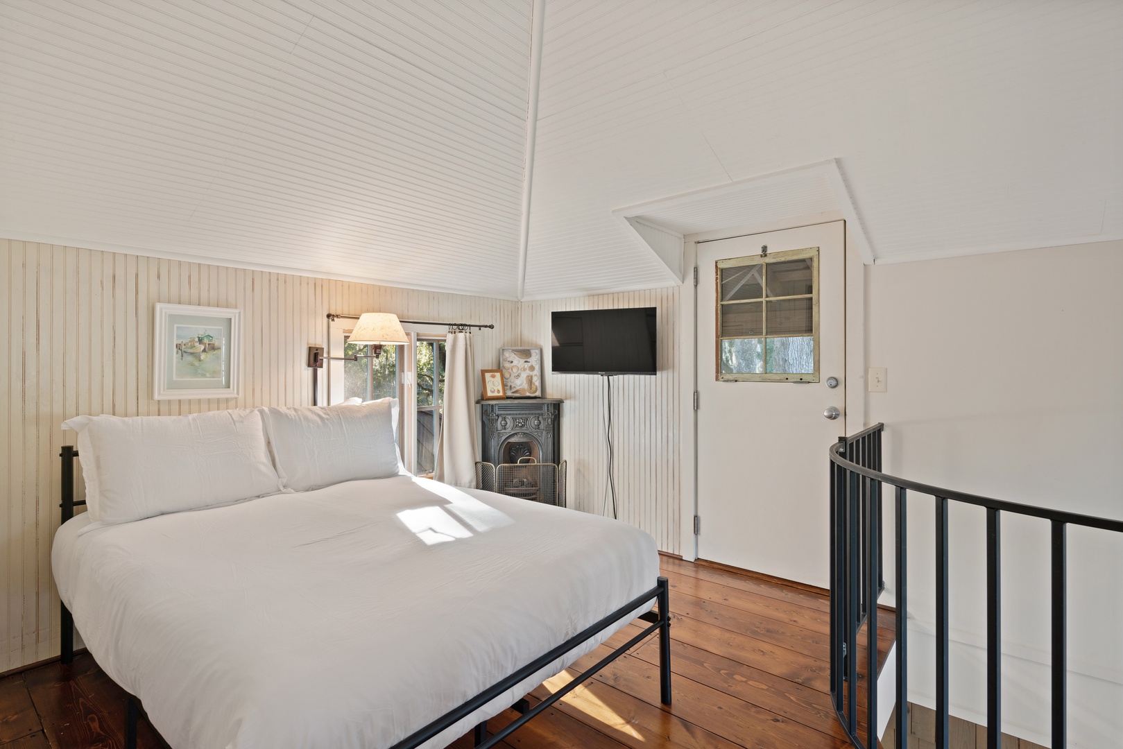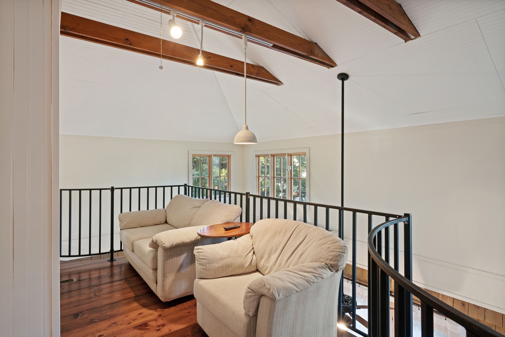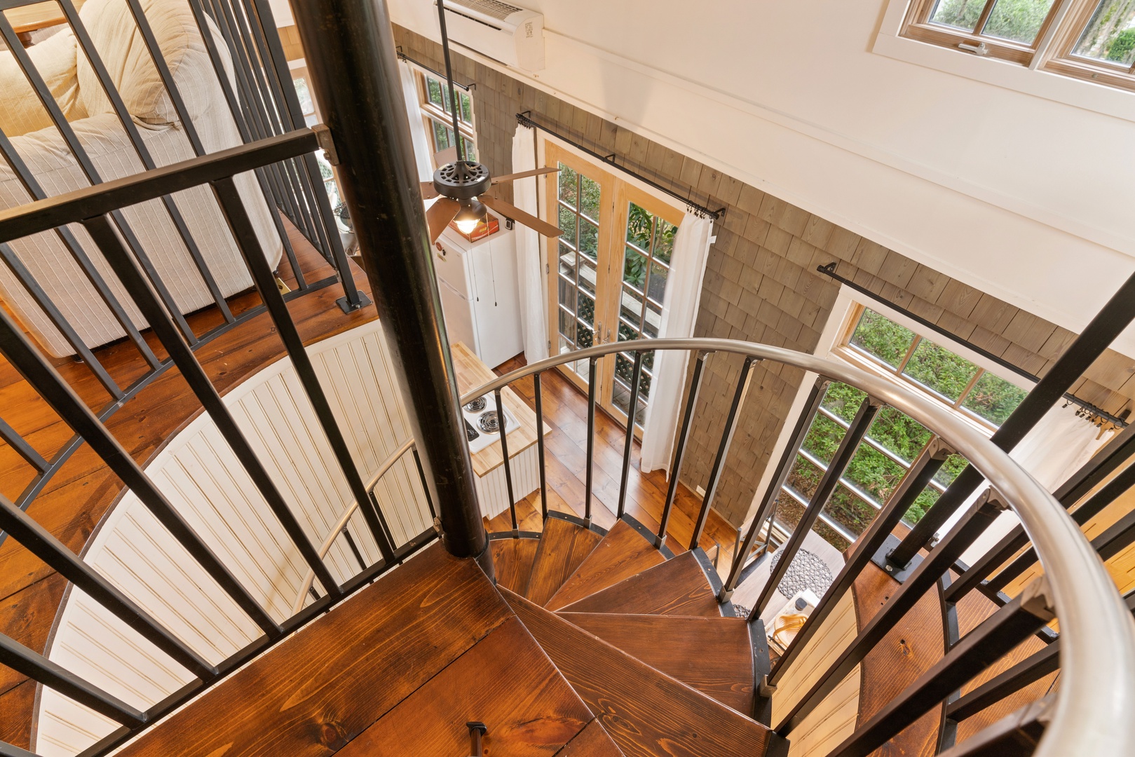 Winding up the spiral staircase (15-steps) to the loft area are 2 full size beds (32" smart TV), 2 seat sofa and a chair, with access to the screened in upper porch.