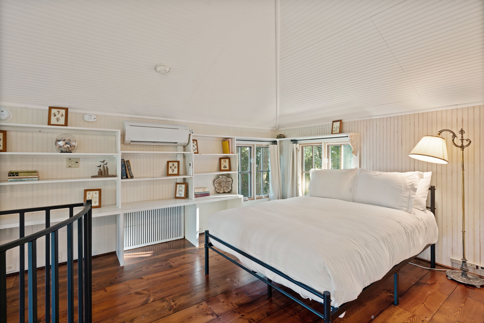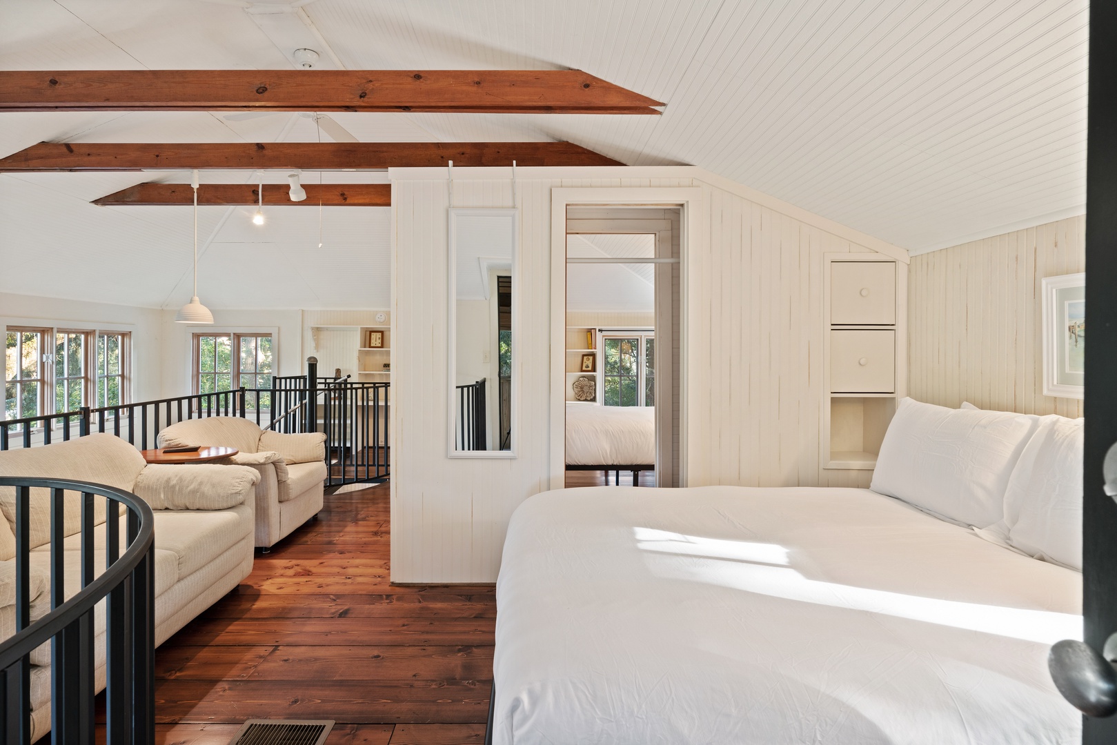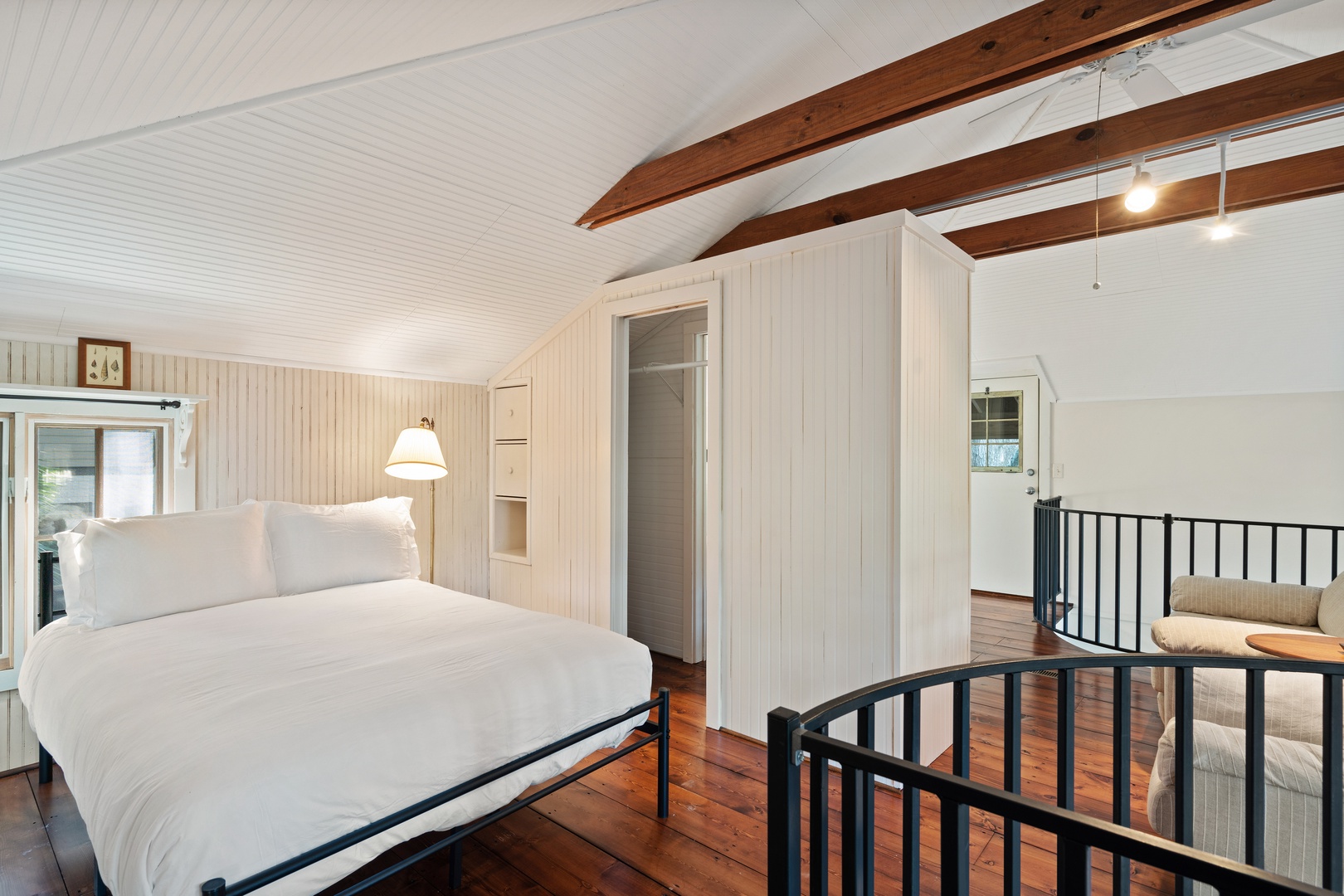 Winding up the spiral staircase (15-steps) to the loft area are 2 full size beds (32" smart TV), 2 seat sofa and a chair, with access to the screened in upper porch.