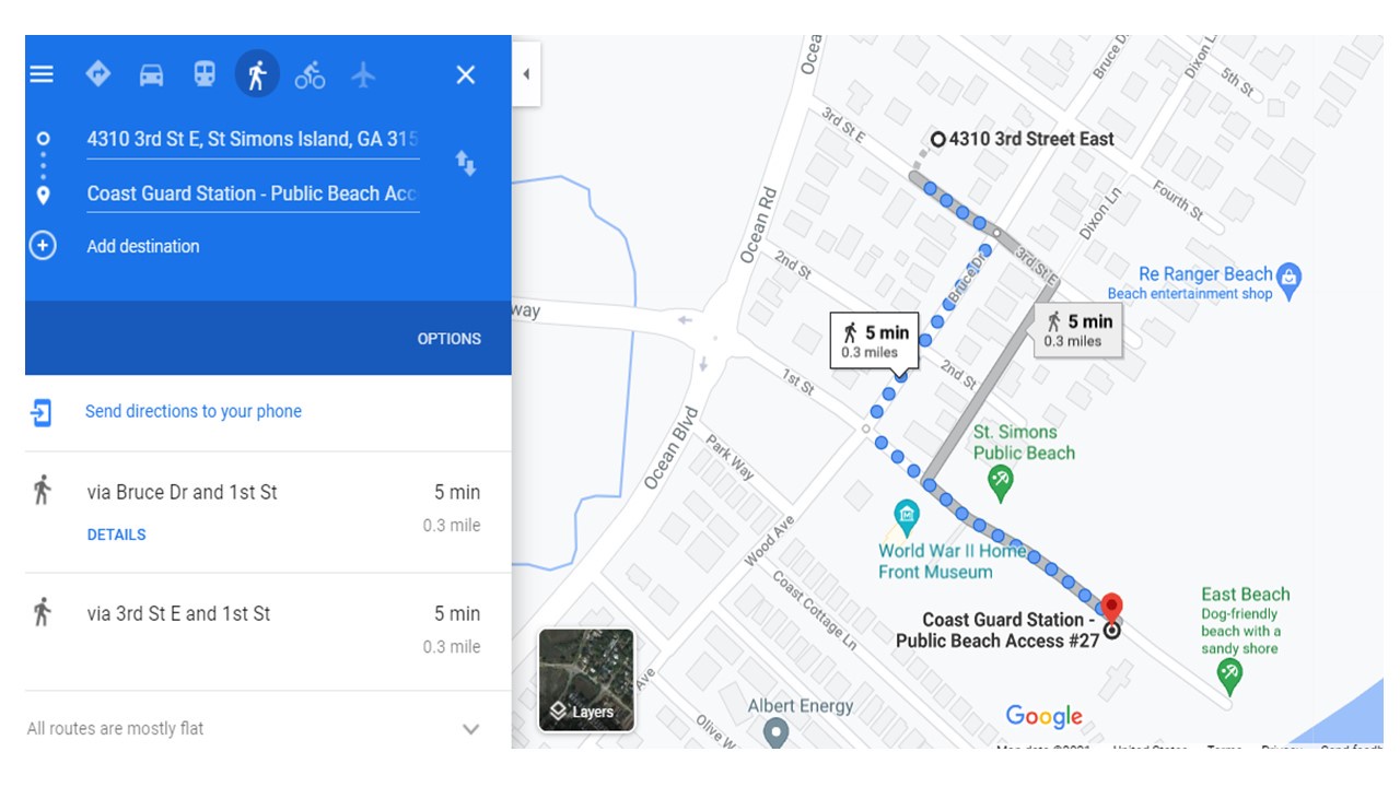 The stretch of beach along the ocean side of St. Simons Island is known as East Beach. A quant neighborhood of single-family homes begins at the access point of the U.S. Coast Guard Station at the northern tip and ends at the southern point of Gould's Inlet by access of Bruce Drive, which runs down the center of East Beach. The Coast Guard Station houses the present home to the World War II Home Front Museum.
