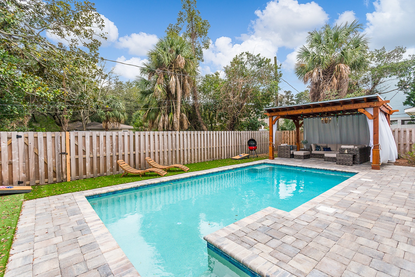 The back yard is a poolside paradise including a large pool cabana - lay out in the sun or enjoy the shade. If you can toss a bean bag, try out our corn hole tournament area. We installed artificial turf around the pool so there'll be no grass clippings. The pool can optionally be heated for a charge of $75/day.